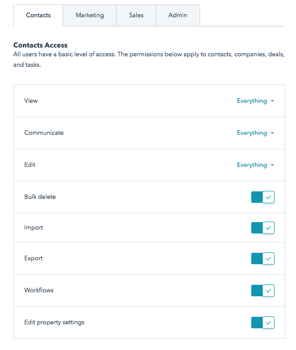 Once you create teams, what can you do with them? For one, you can set someone’s permissions so that they see see all records (Contacts, Companies, Deals, Tasks, and Properties) that are owned by them or a teammate. This is very useful.