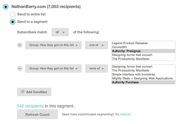 I love Nathan Barry’s post on how he does email marketing. One small, but important, detail that I picked up the second time through the post is that Nathan keeps all of his subscribers in a single MailChimp list and then segments them down by signup source in order to deliver the most relevant content.